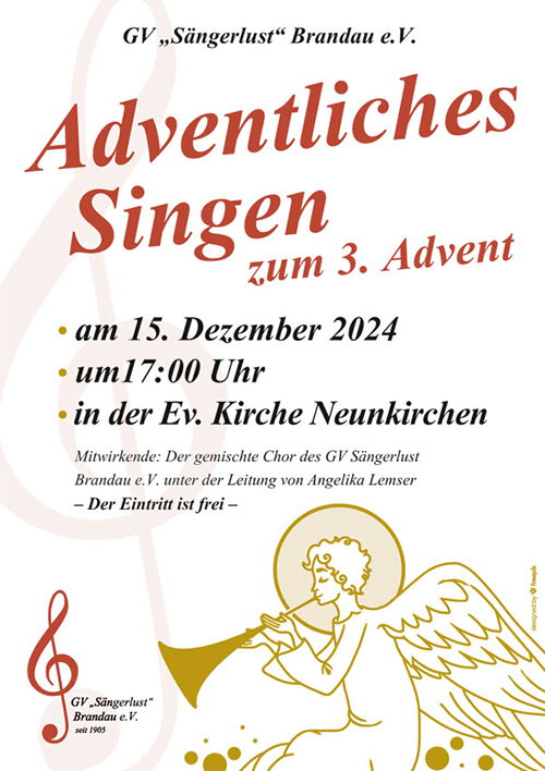 Die Sängerinnen und Sänger des gemischten Chores des Gesangvereins "Sängerlust" Brandau unter der Leitung von Angelika Lemser laden Sie zum Adventskonzert herzlich ein. Der Chor freut sich, das Ergebnis vieler Chorproben dem Publikum präsentieren zu können.