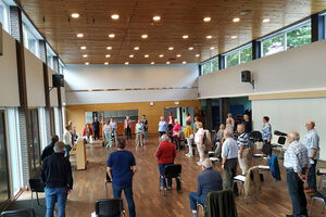 Und dann wurde auch bei uns die Chorarbeit von der Corona-Pandemie stark eingeschränkt bzw. auch zum Erliegen gebracht. Alle Räumlichkeiten der Gemeinde waren gesperrt und damit auch unser Chorprobenraum in der Hofreite. Im Mai 2020 haben wir versucht, auf dem Parkplatz am Bürgerhaus eine Probe abzuhalten. Später dann im Bürgerhaus mit ganz strengen Abstandsregeln. Von Juni bis Oktober 2020 konnten wir proben, immer nur mit zwei Stimmen im Wechsel. Da die Infektionswelle immer schlimmer wurde, waren die Chorproben monatelang ausgesetzt. Erst 2022 wurde der Saal in der Hofreite wieder für Chorproben freigegeben.